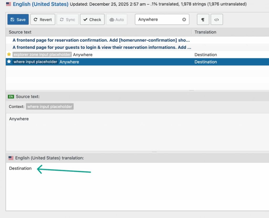 Most text strings within the HomeRunner platform are prepared as .POT files, allowing them to be easily customized or translated. This guide outlines how to modify these strings (e.g., changing search bar placeholders like “Anywhere” to “Destination”) using the free Loco Translate plugin.