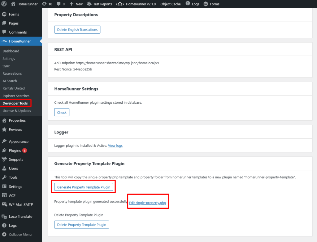 - Go to WordPress Admin → HomeRunner → Developer Tools