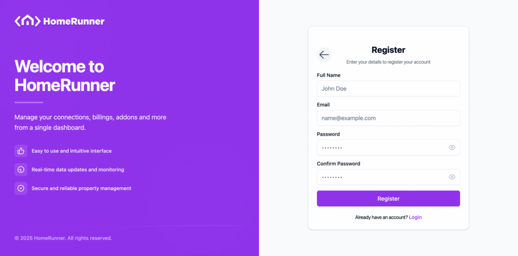 To get a new Homerunner account, navigate to register account. You will get below page. If you wanna register real quick, click on “Continue with Google” and register using your gmail account. Otherwise continue with email.