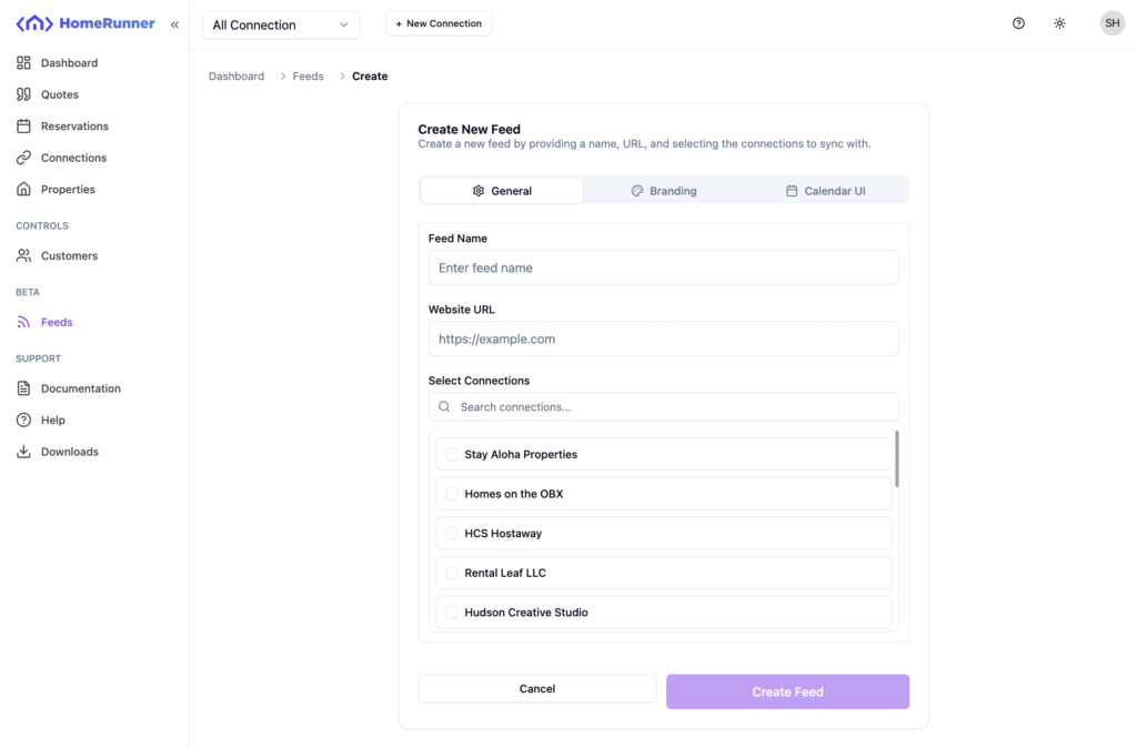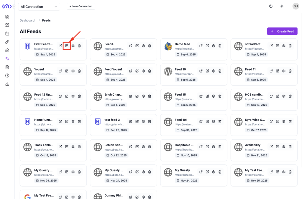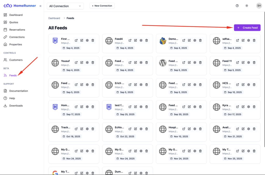 Feed is a combination of one to many connections and their properties. You can create and configure feeds from dashboard and connection them from your websites. Feed is the future of Homerunner.