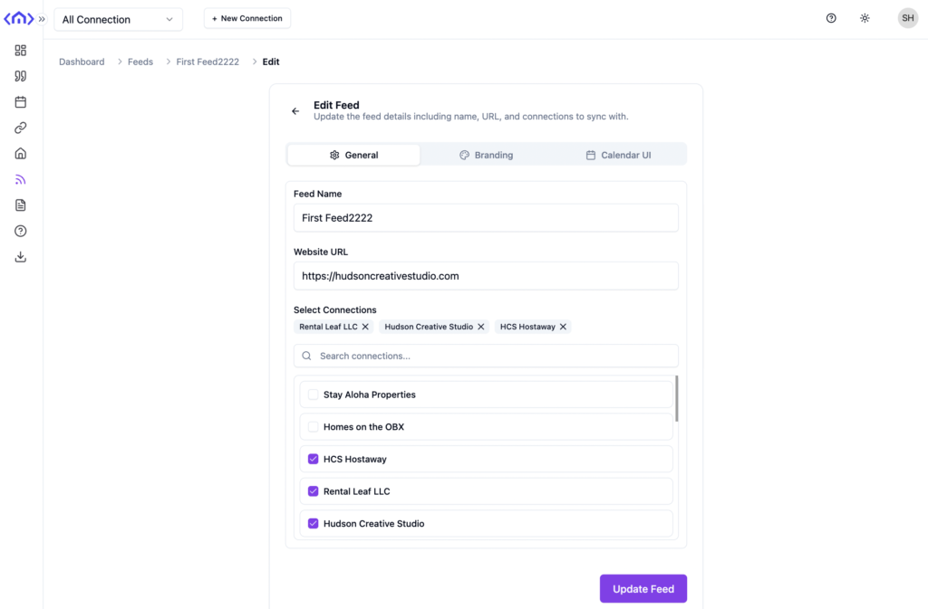 Feed name, website url and connection selection is required. You may select a single connection or multiple, the feed will serve data from those connections under the hood.