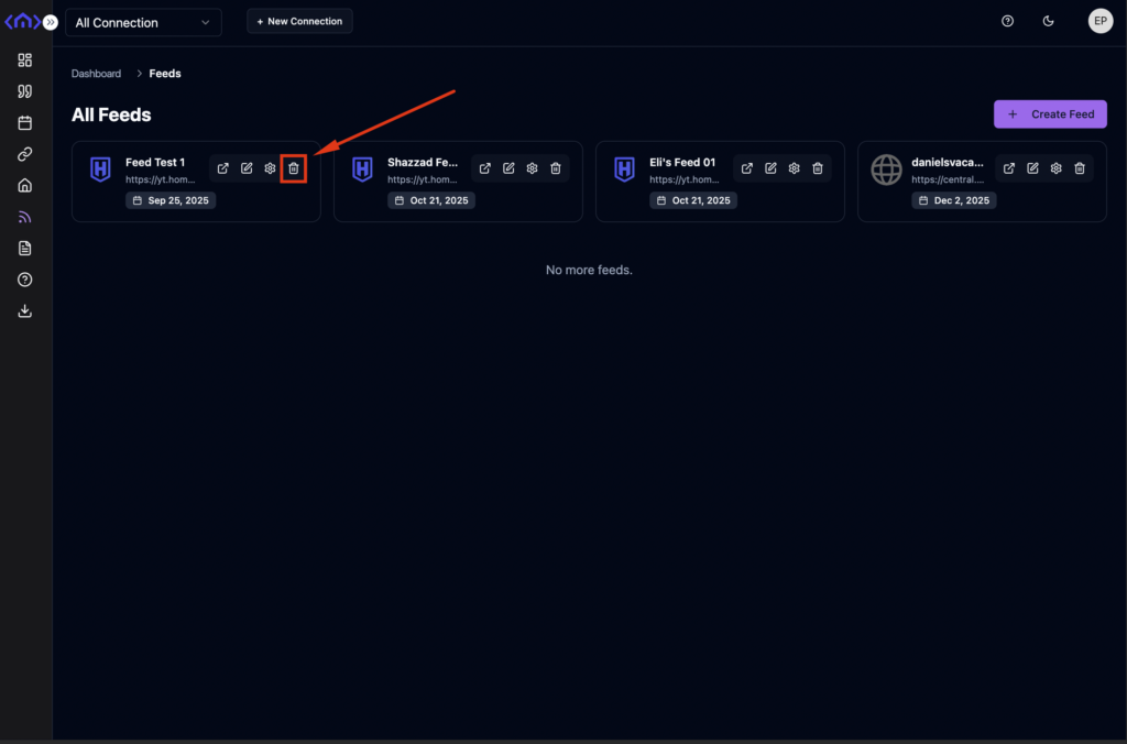 Removing a feed from Homerunner is simple. Click on the trash icon from the specific feed card.