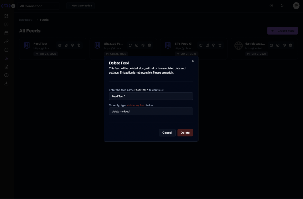 Fill those fields and click on Delete. The feed will be deleted instantly.