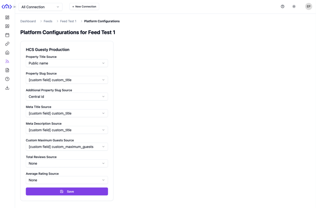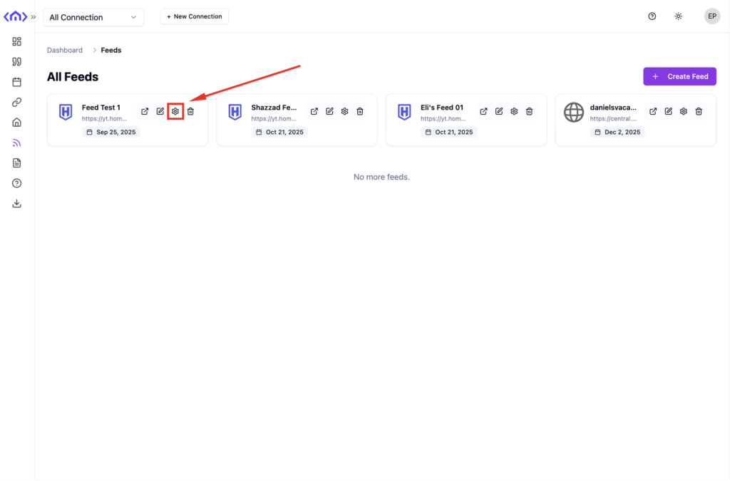 You can edit various connection related fields, map PMS fields with Homerunner from Connection Configuration screen. If you want to override those config in feed level, click on the gear icon from the specific feed card like below.