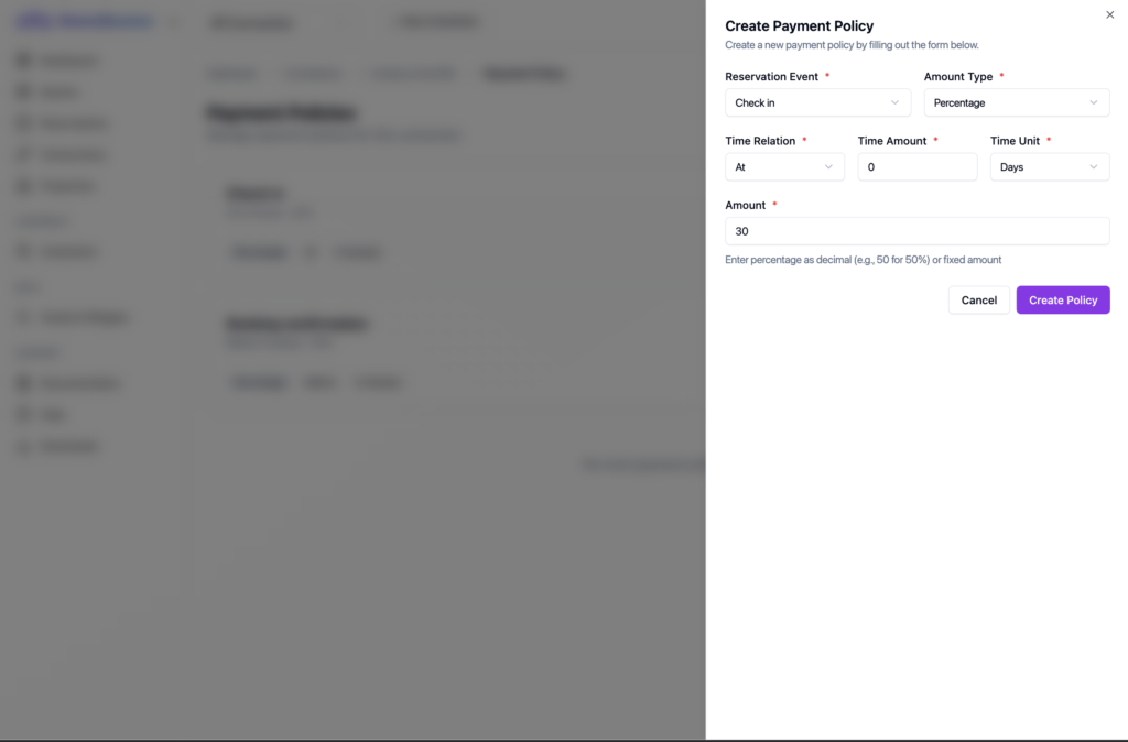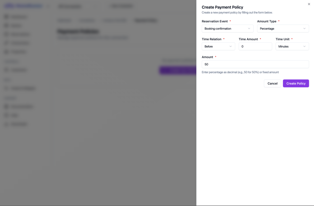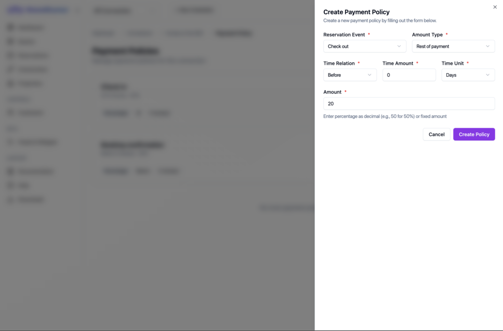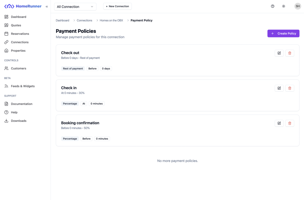 If you want customize the default payment behaviour for a connection, like if you want your customer will pay 50% during booking confirmation and other 50% of the payment on checkout, Homerunner has something builtin for you. We call it payment policy. Let me guide you through the process of defining a below payment policy.