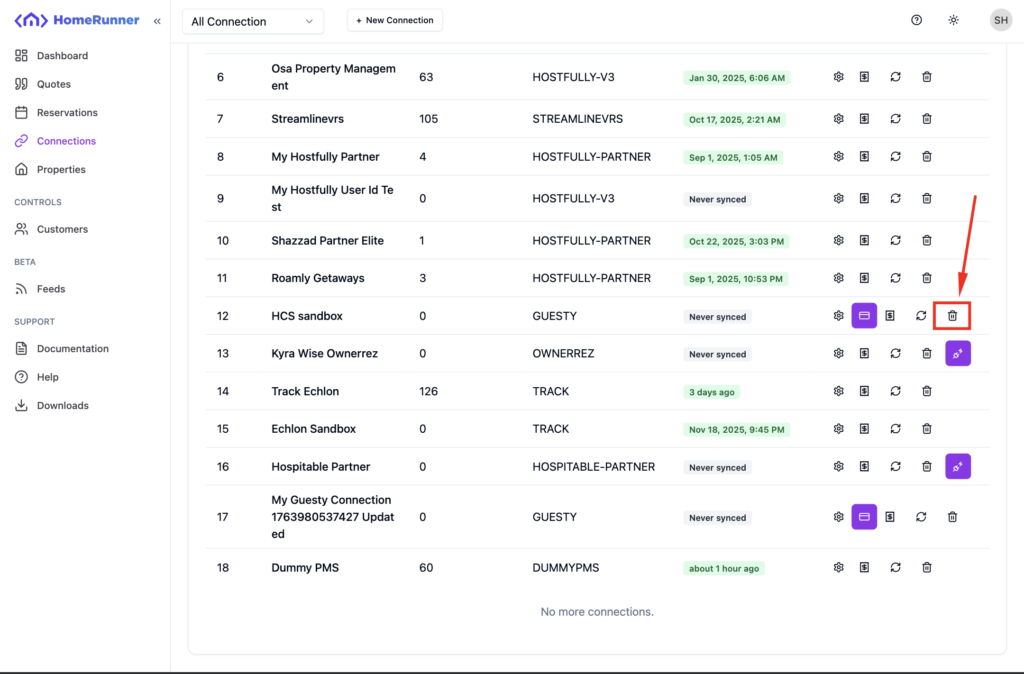 Click on the trash icon related to the connection. A popup will come up asking for confirmation. Follow the instructions.