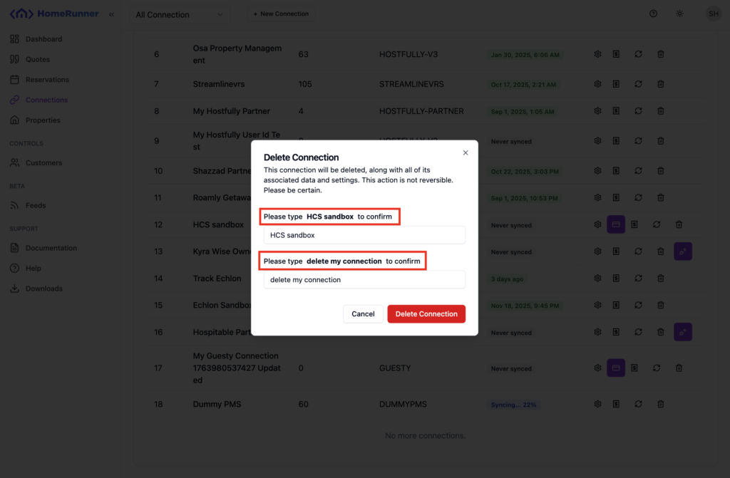 After filling asked fields, click on delete connection. The connection will be removed from the system.