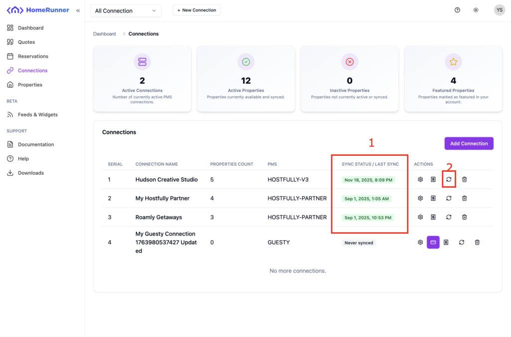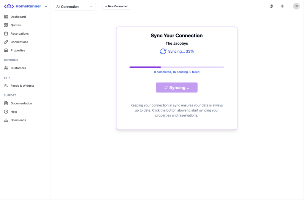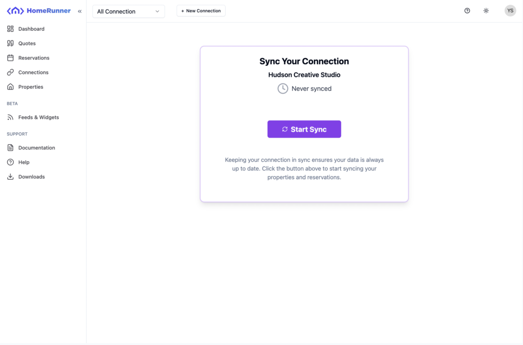 Homerunner server sync properties, reservations, reviews and other necessary data from your connected PMS. If auto sync is on, Homerunner will auto sync your connection. You can manually sync your connection too.