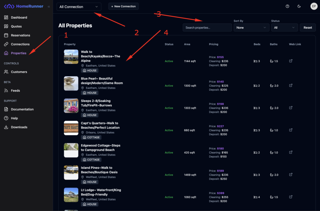 Homerunner will sync, store and show all your properties from all your PMS connections. Go to Properties (red arrow 1) from sidebar.